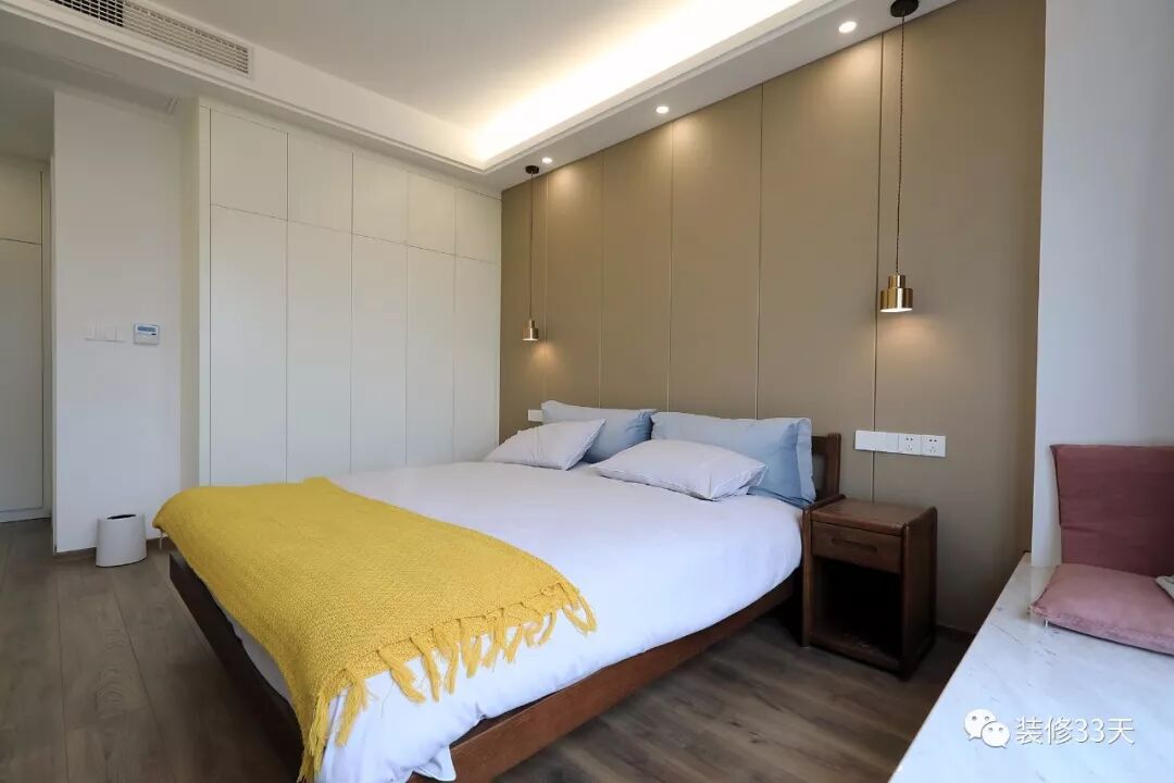 ▲ 主卧,木质地板与卡其色硬包床背景为室内增加自然温度,床侧设计置顶衣柜,以满足收纳需要