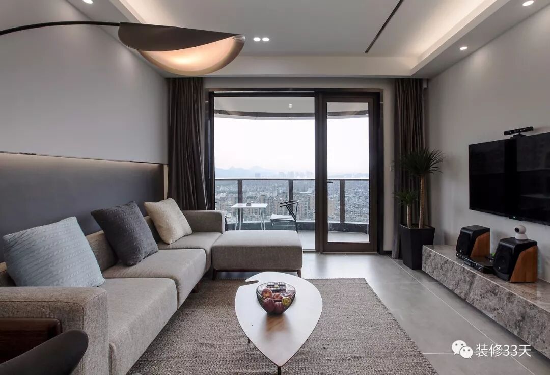 ▲ 客厅相邻无敌景观阳台,无主灯顶面搭配水泥色瓷砖,沙发背景黑钛金不锈钢条+灯带,一种悬浮的高级感油然而生