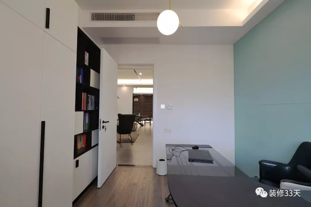 ▲ 书房兼做未来的儿童房,选择黑白搭配水蓝色背景墙