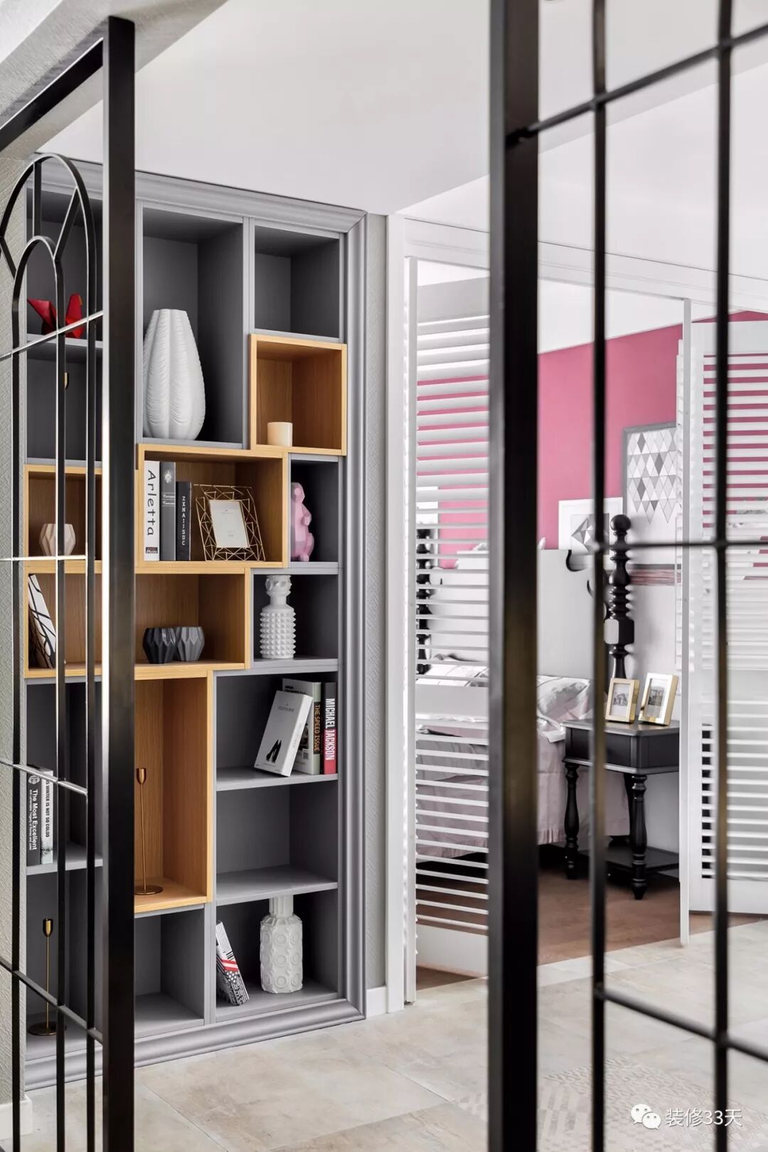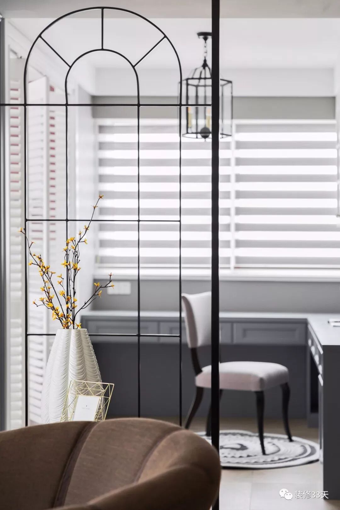▲ 将北边房间的墙面敲掉,设计一个敞开式书房区域,运用对称的铁艺隔断将书房与客厅相连