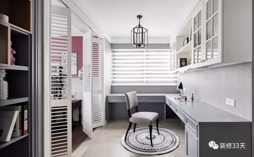 ▲ 书房打造L型写字台,满足四口之家的学习与娱乐,书房又与次卧连接,白色百叶折叠门让卧室和书房有一个既敞开又连接的功能