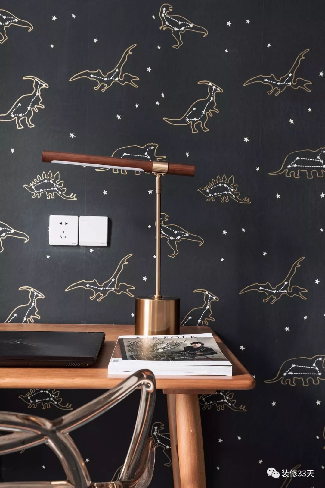▲ 黑色基底壁纸配木色书桌,金属元素与木质结合的台灯,既作装饰更具功能性