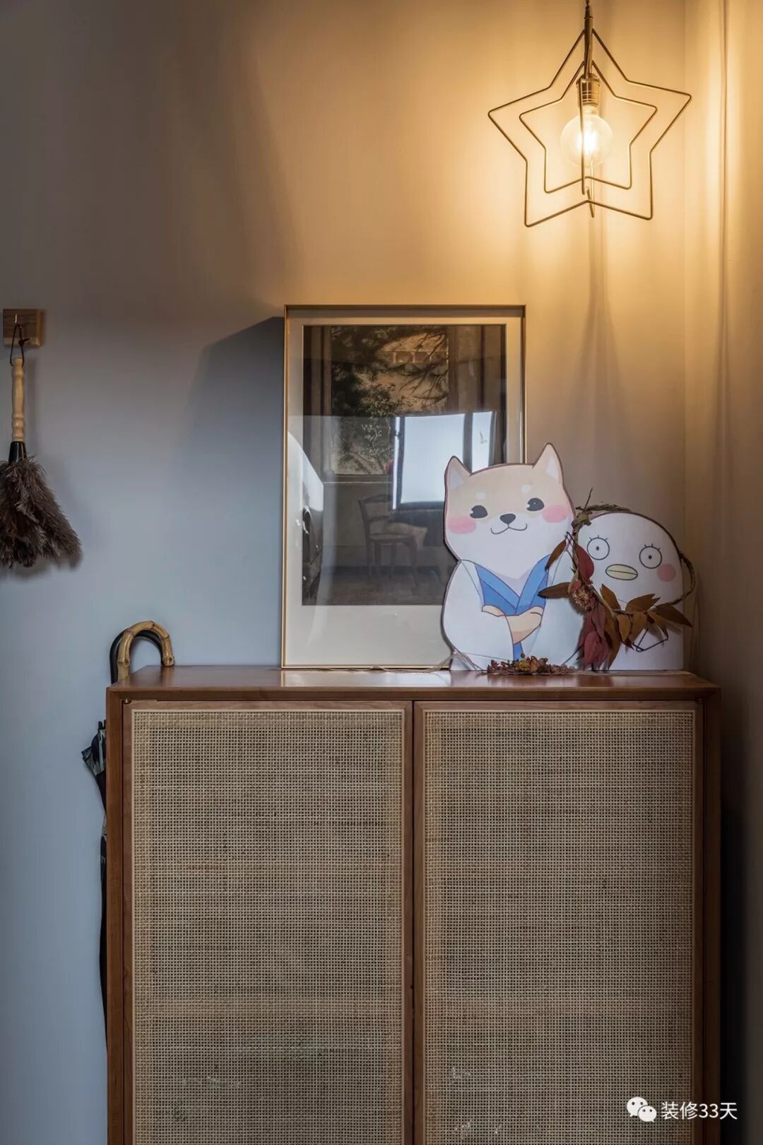 ▲ 使用面积120平,造价35万(不含电器),入户藤编网面的鞋柜,星星吊灯营造玄关氛围