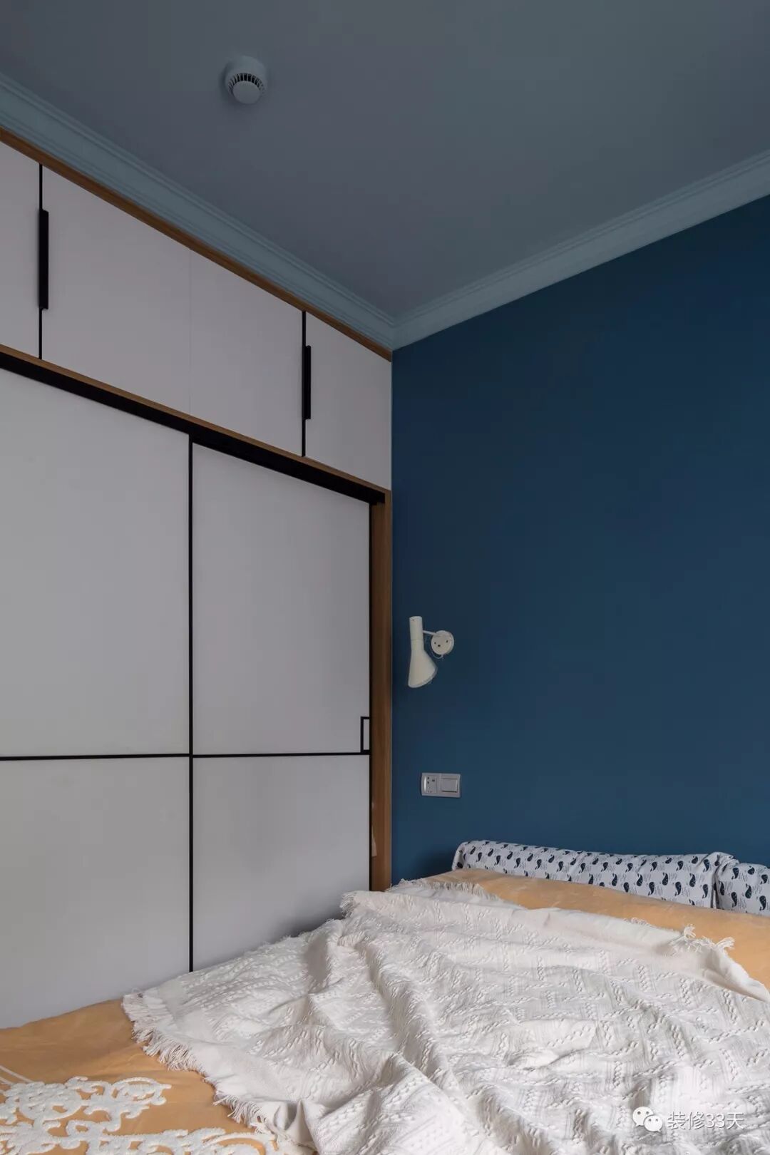 ▲ 主卧,靛青色墙面搭配灰蓝色顶面,给人轻松舒适的氛围,柜体基调与次卧呼应