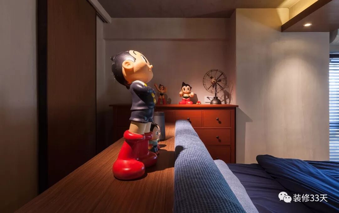 ▲ 床头摆放主人心爱的铁臂阿童木摆件,床边的红色斗柜打破空间用色的沉寂,让空间显得更有层次