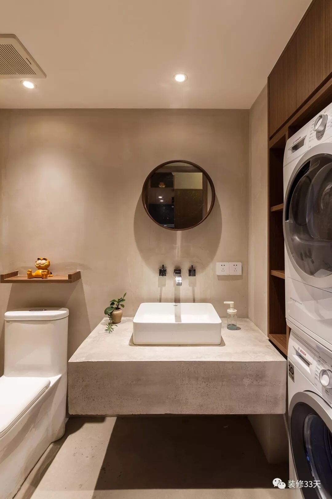 ▲ 客卫,洗手台为水泥浇筑,与墙面做成一体,利用右侧墙面做洗衣机柜,满足洗衣烘干功能
