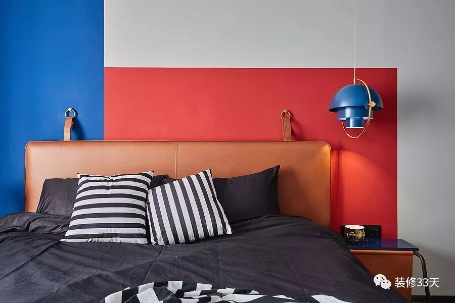 ▲ 墙面乳胶漆刷出不同颜色,搭配皮质床靠,呈现出满分效果