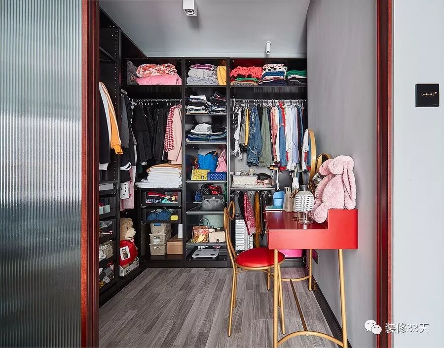 ▲ 满满当当的衣帽间,衣柜出自宜家,搭配各种配件,衣帽间目前仅够女主人使用,如果以后空间不够,可以将梳妆台移到外面,靠墙再加一排衣柜