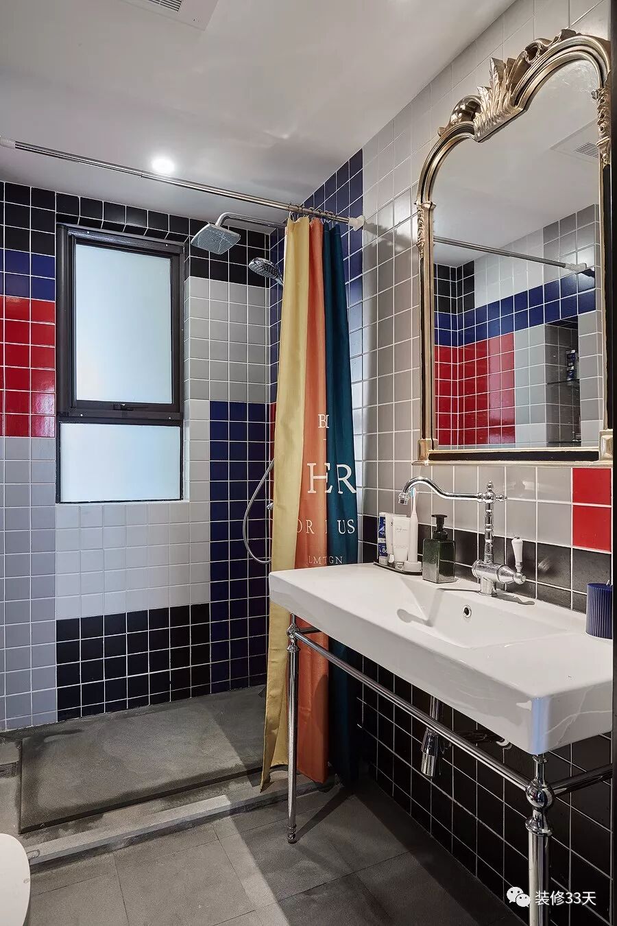 ▲ 卫生间小方砖元素与厨房呼应,色彩搭配更缤纷,墙面铺贴小砖,不仅对色彩和材质的掌控力有极高的要求,更要求设计师和工人眼神好、有耐心