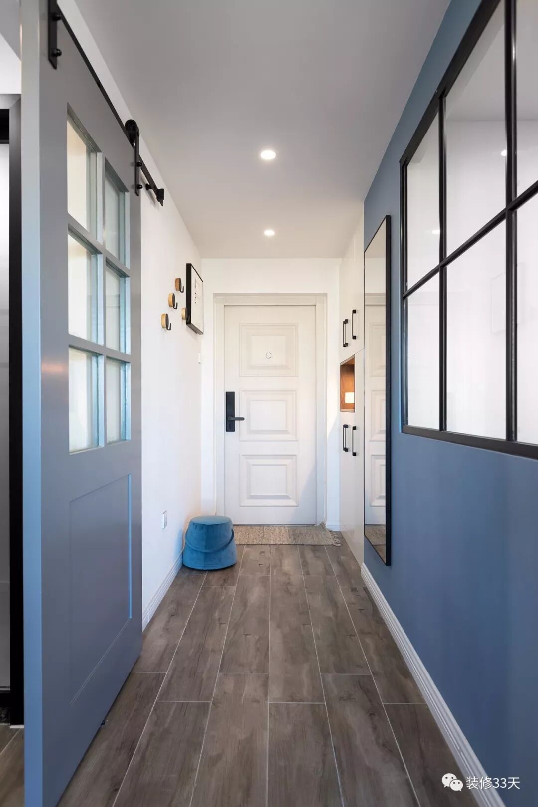 ▲ 进门右手边就是卫生间,一扇蓝色谷仓门与玄关过道相隔,推开谷仓门就是洗手台,实现干湿分离