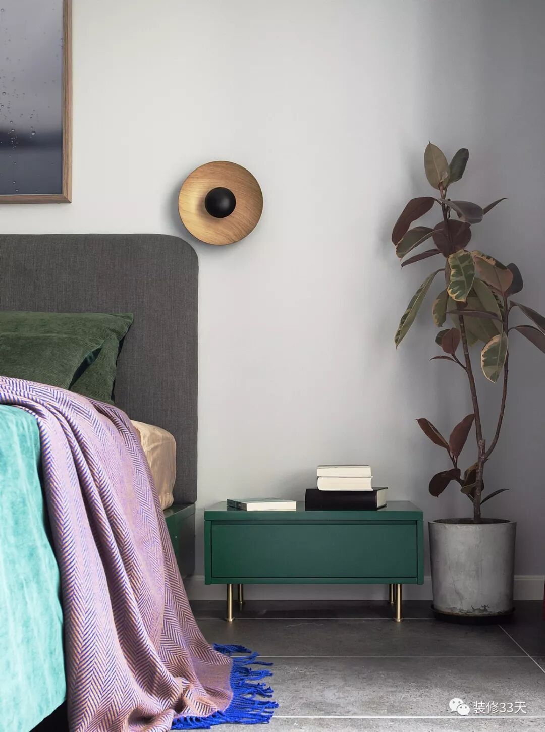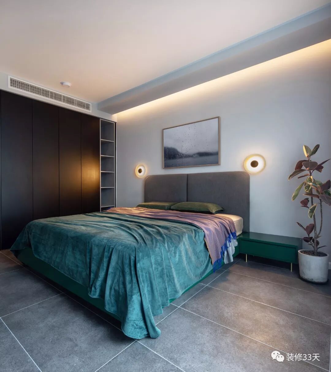 ▲ 主卧地面选用瓷砖铺贴,黑色哑光柜体,顶面采用灯光洗墙,背景用设计师摄影作品点缀,床体更是选用迷人的绿色,具有复古气质