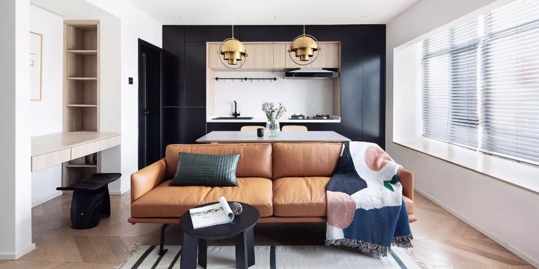 ▲ 客厅摒弃沙发正对电视机背景的制式,治愈系棕色皮质主沙发,与黑色皮质单椅相对摆放,一盏钓鱼灯,造型充满趣味性