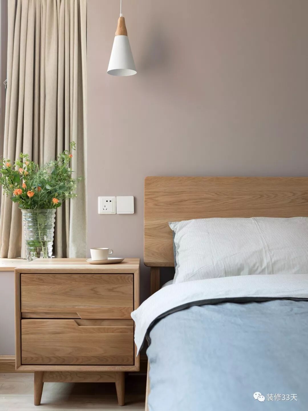 ▲ 次卧,一面莫兰迪色柔美的背景墙,简单的装饰两幅挂画,搭配木质家具与地板,简单却很温馨