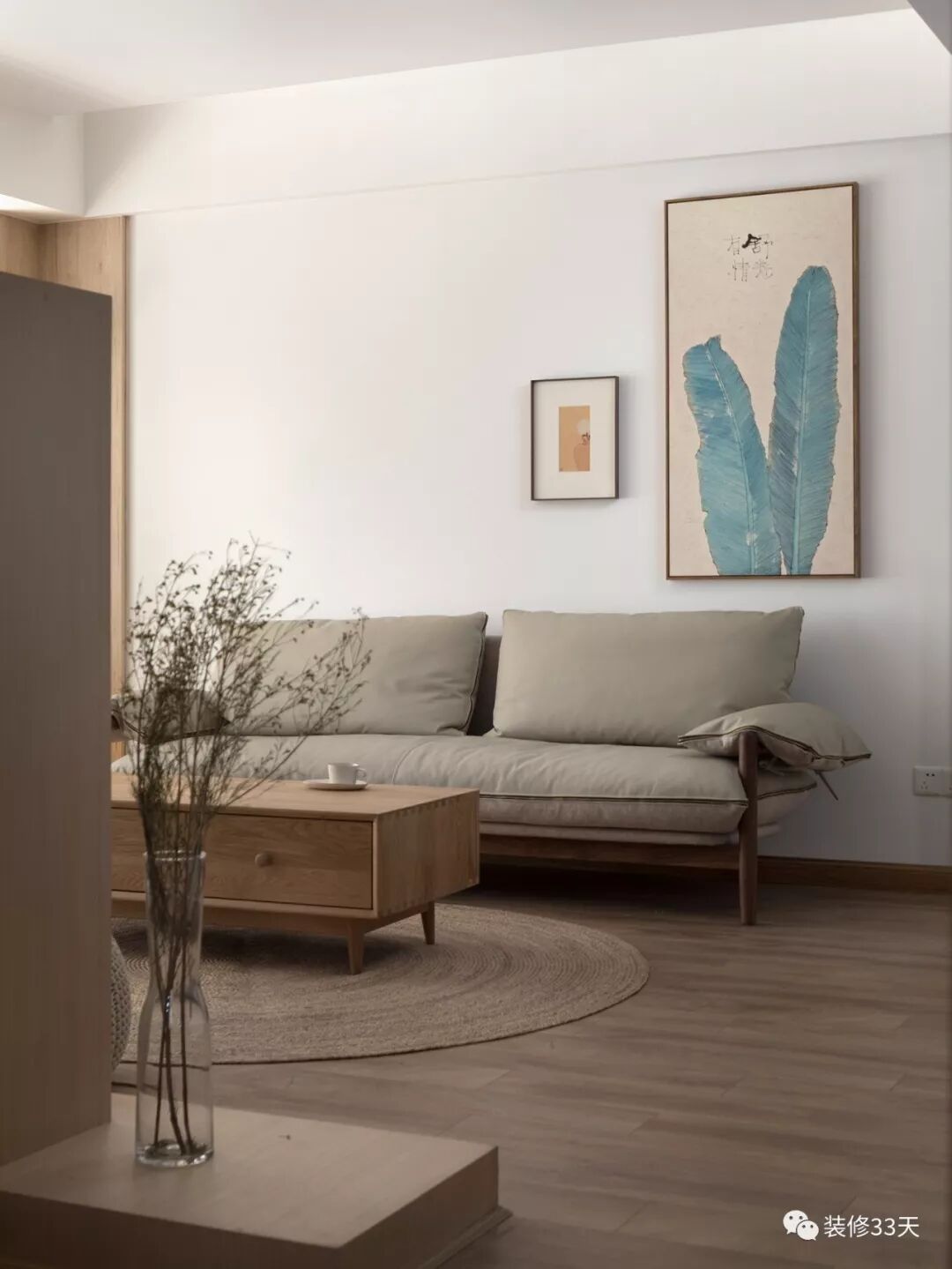 ▲ 灰色皮质沙发,低饱和的色调与室内基调更为融洽,麻质编织地毯搭配实木茶几+针织蒲团,布置出日式的休闲格调