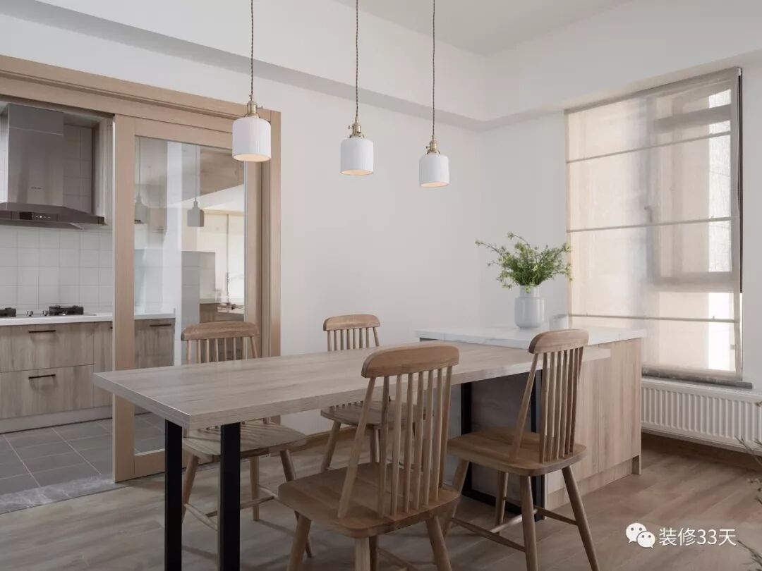 ▲ 餐厅,原木餐桌面穿插入中岛吧台,搭配温莎椅和简约精致的小吊灯