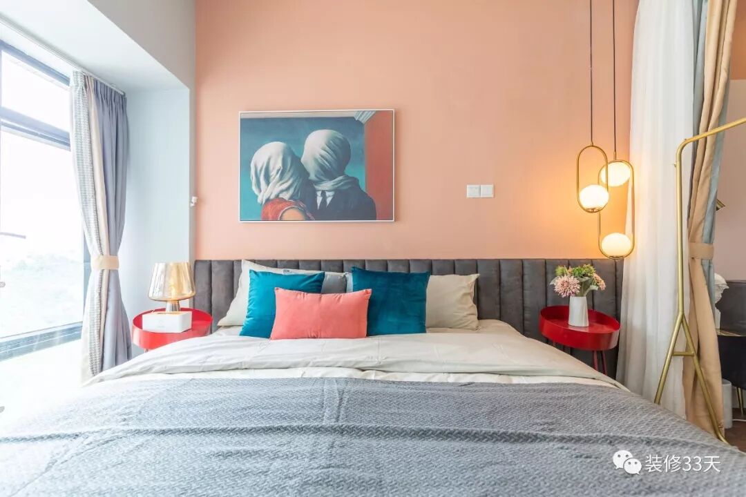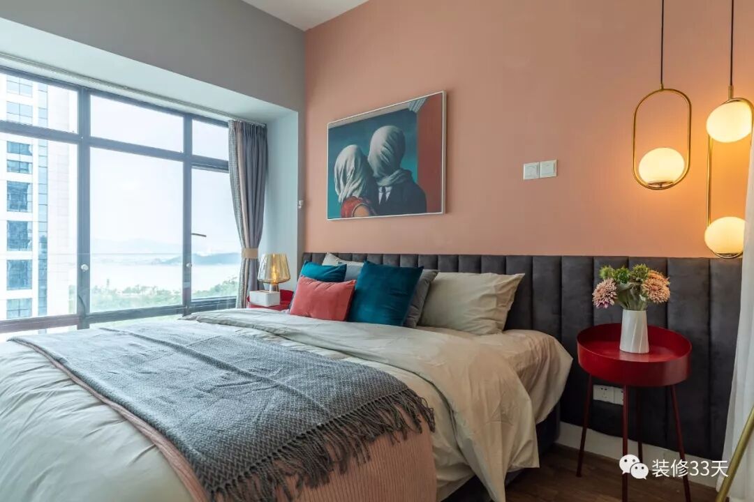 ▲ 卧室的墙面用色延续客餐厅主调,床尾同样采用莫兰迪风格的画作修饰背景