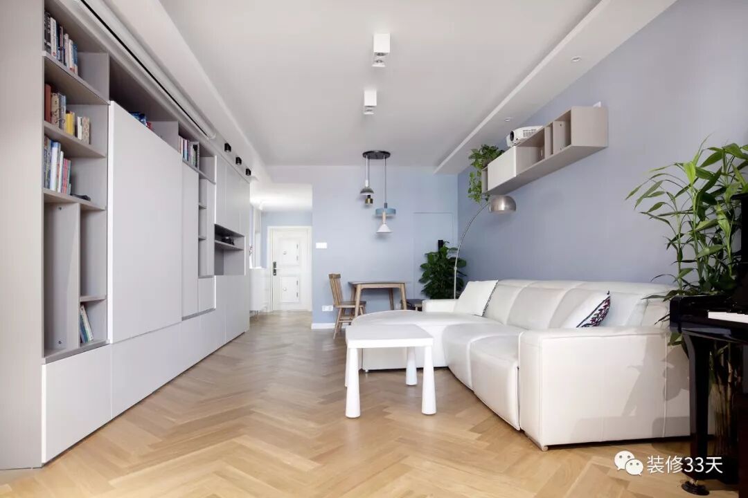 ▲ 客餐厅互通,中性的白色和冷色调的淡蓝色搭配,让客厅倍显宁静,适合一家6口人在此享受天伦之乐