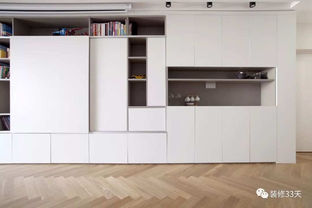▲ 电视墙是用长条形乳白色木板拼接而成的,错分的格子,电视墙通高到顶,这使客厅的存储面积大大增加,电视墙是后期定制安装的,所以要注明未来电视的安装尺寸和其他预留位置的大小,留出背板开口,做好预判