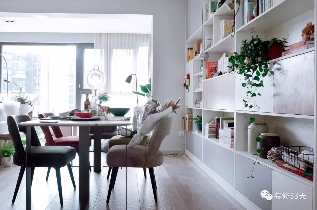 ▲ 餐厅背景采用整面储物柜的形式,半开放的柜体用于收纳与展示,同时丰富了整个客餐厅