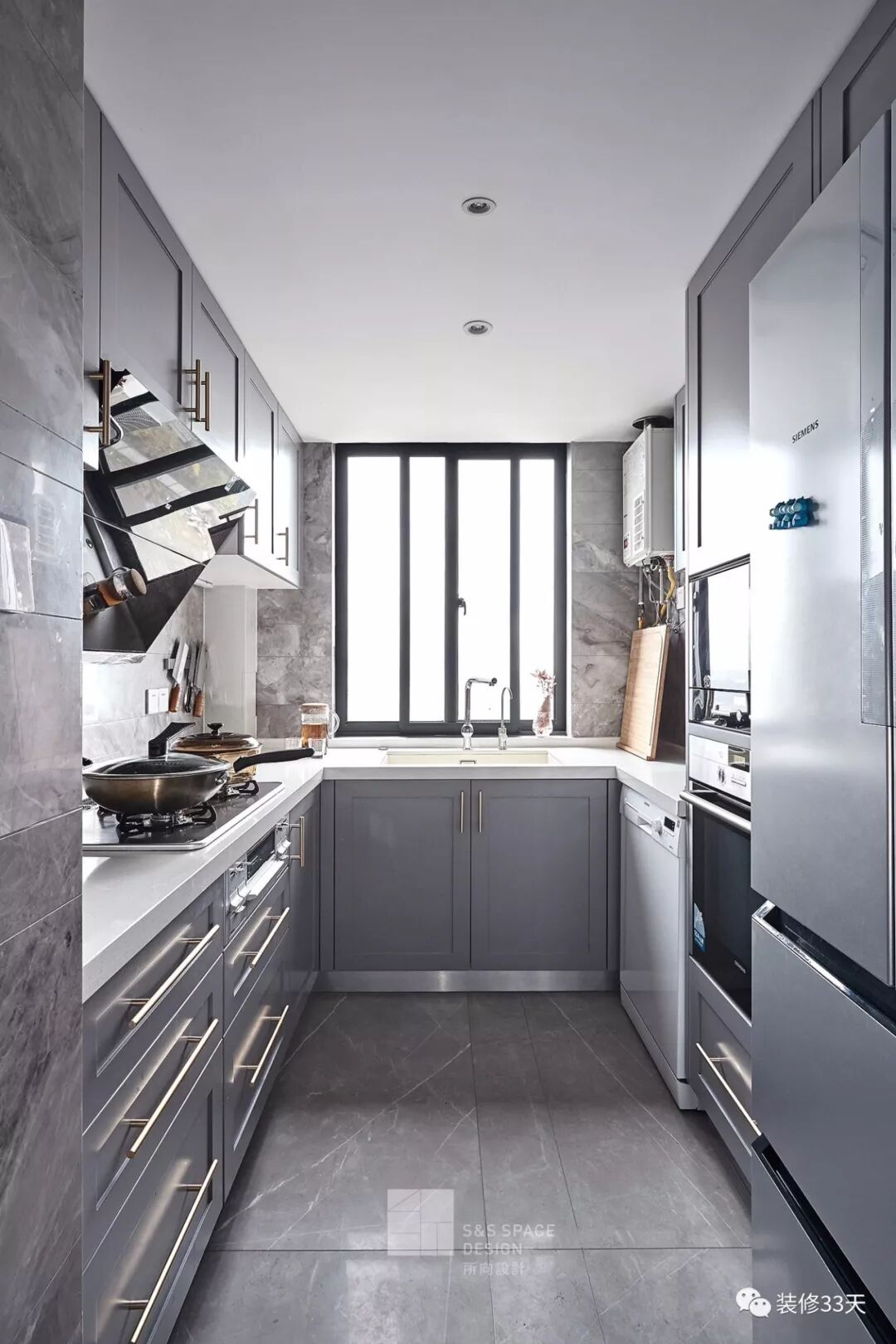 ▲ 厨房,使用灰色柜门,白色的台面营造出一个宽敞明亮的做餐环境,金色线条型拉手也提升空间的精致感