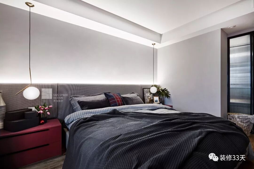 ▲ 主卧,深灰色的软包背景墙+隐藏光源,使空间柔软许多,床头柜配上精致的吊灯