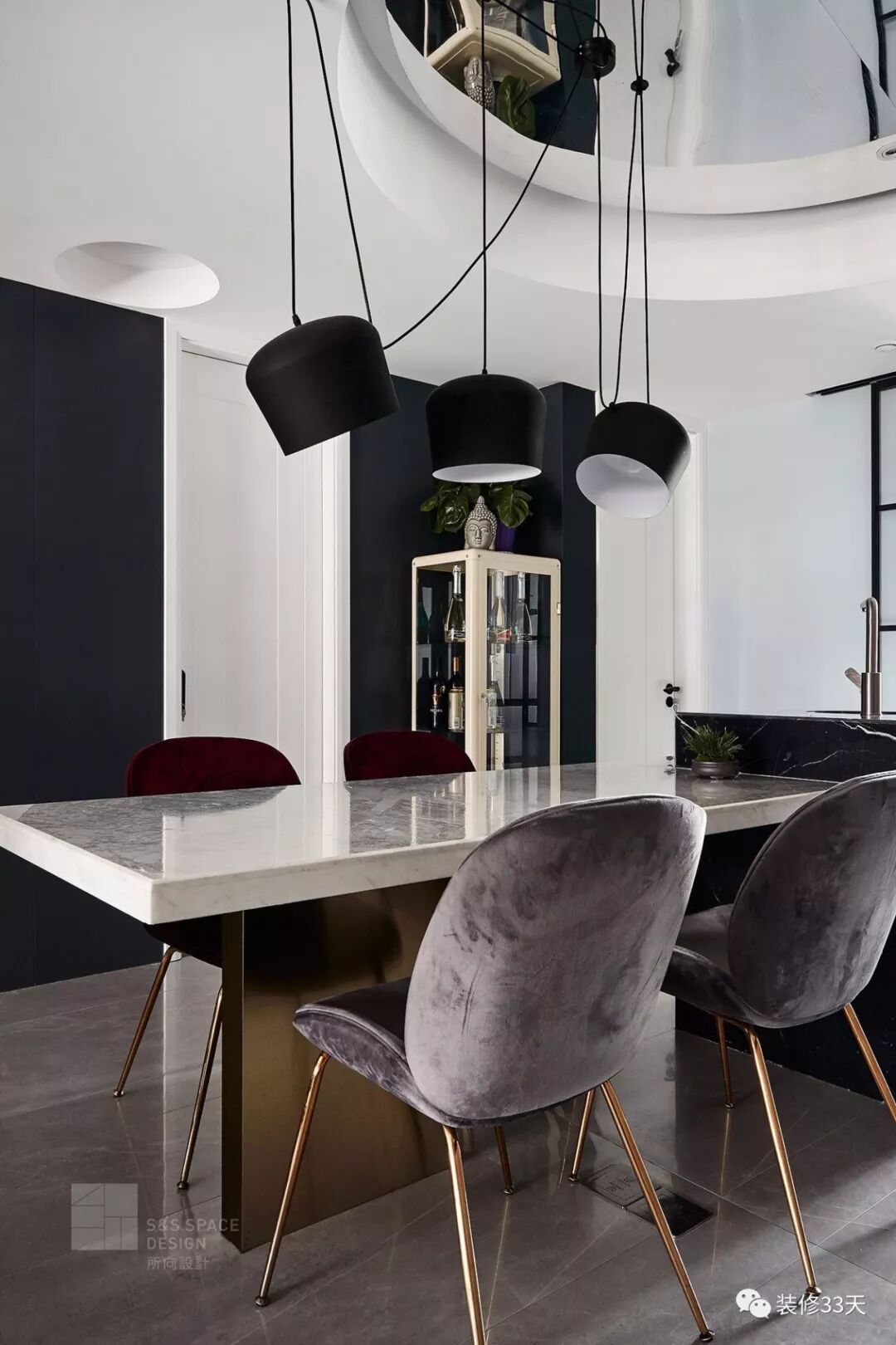 ▲ 白色的大理石餐桌嵌入黑色的中岛里,颜色的交替与整体空间融为一体,既平衡空间色彩,也增加就餐的面积和使用功能