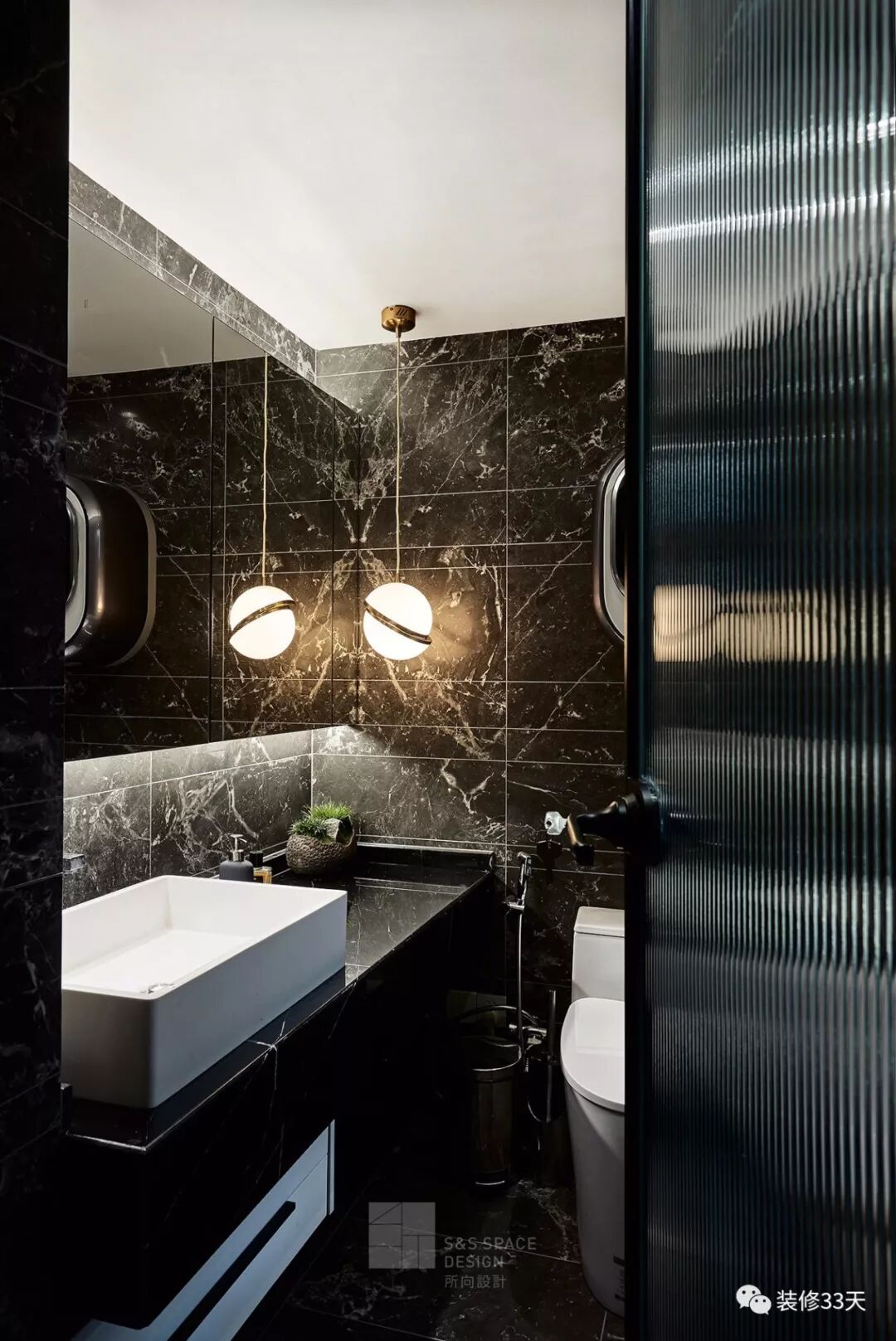 ▲ 为增加卫生间的通透感和采光,部分墙体使用长虹玻璃来代替,既保证空间的私密性,也解决采光的问题