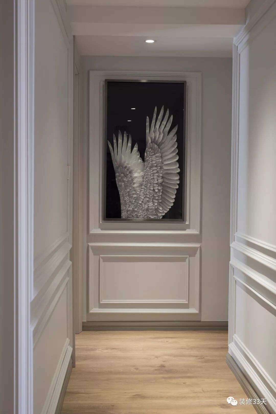 ▲ 走廊墙面的石膏线条与客厅一致,将客厅一直延展到卧室,更显整体统一,尽头处的挂画丰富单调的墙面,白羽毛的画面质感十足