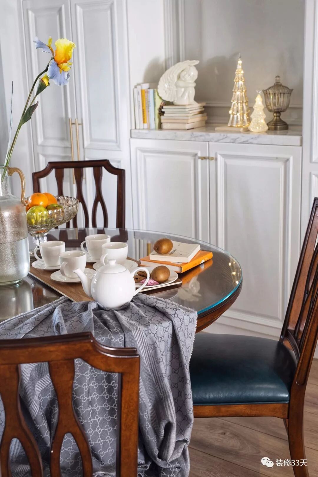▲ 入户右侧是餐厅和客厅主要的收纳区域,为了中和轻奢给人的距离感,复古家具的style融入各种暖暖的元素