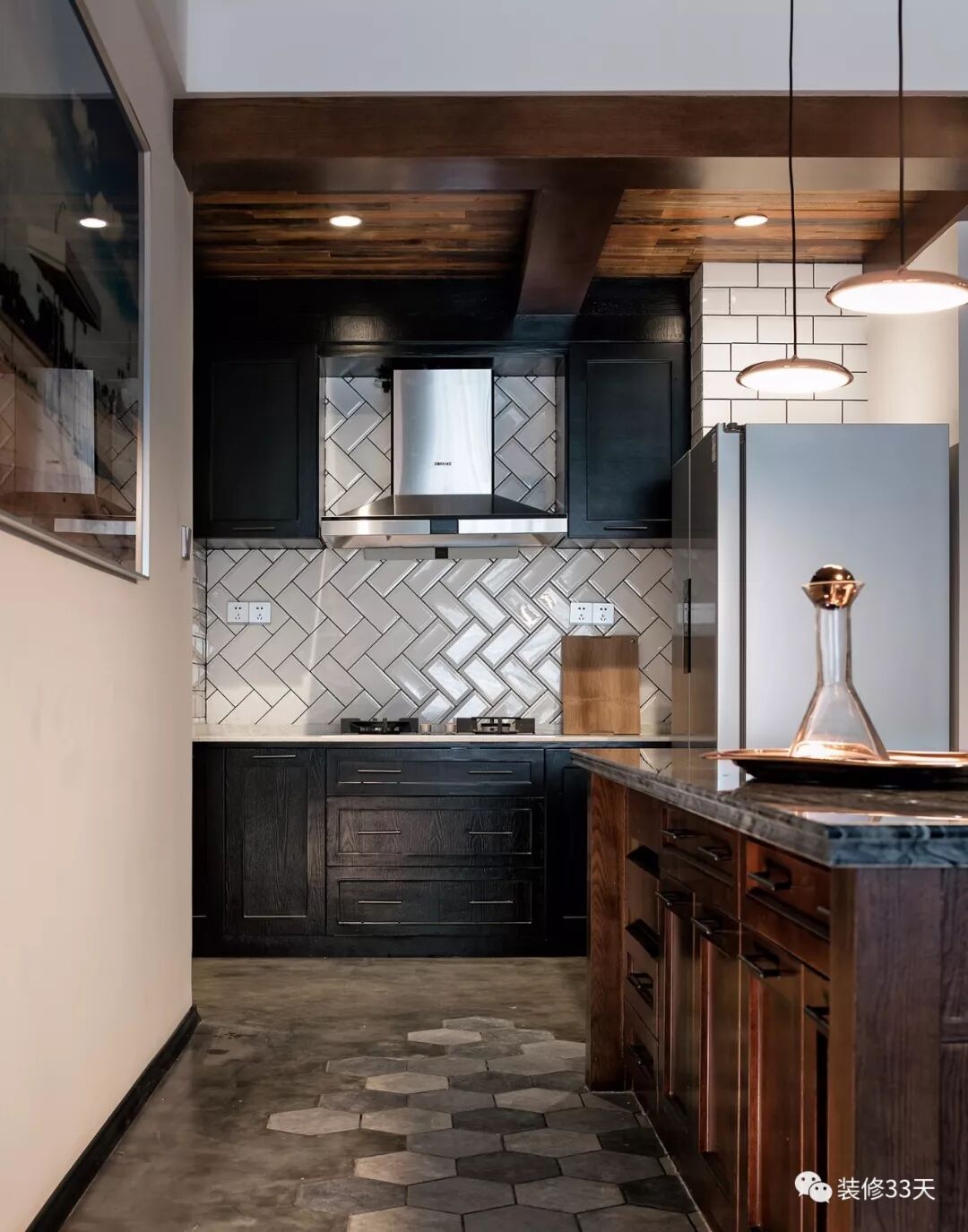 ▲ 餐厨场域,中岛地面使用六角地砖划分,旧木板制作的岛台与相同材质的吊顶相互呼应,配上黑色大理石台面有质感