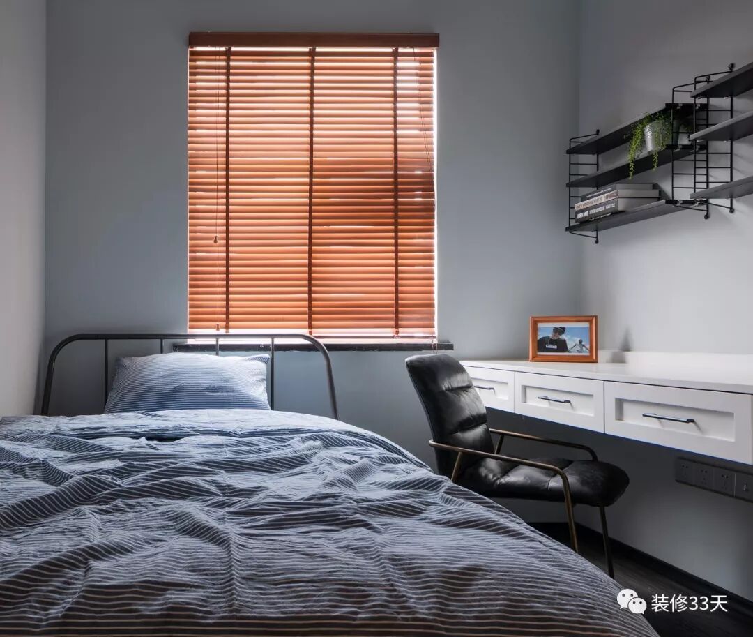 ▲ 次卧选择铁艺单人床、铁艺搁板,配上百叶窗帘,呈现最简单的舒适感,现场制作的书桌摆放电脑、手办、绘画板,让卧室兼具书房功能