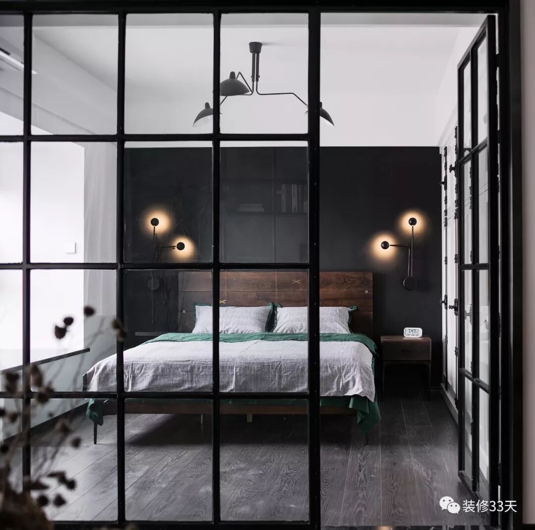 ▲ 黑色床头背景、烟熏木色床头、对称壁灯,简约的卧室空间,色彩的过渡和细节搭配却非常有心思