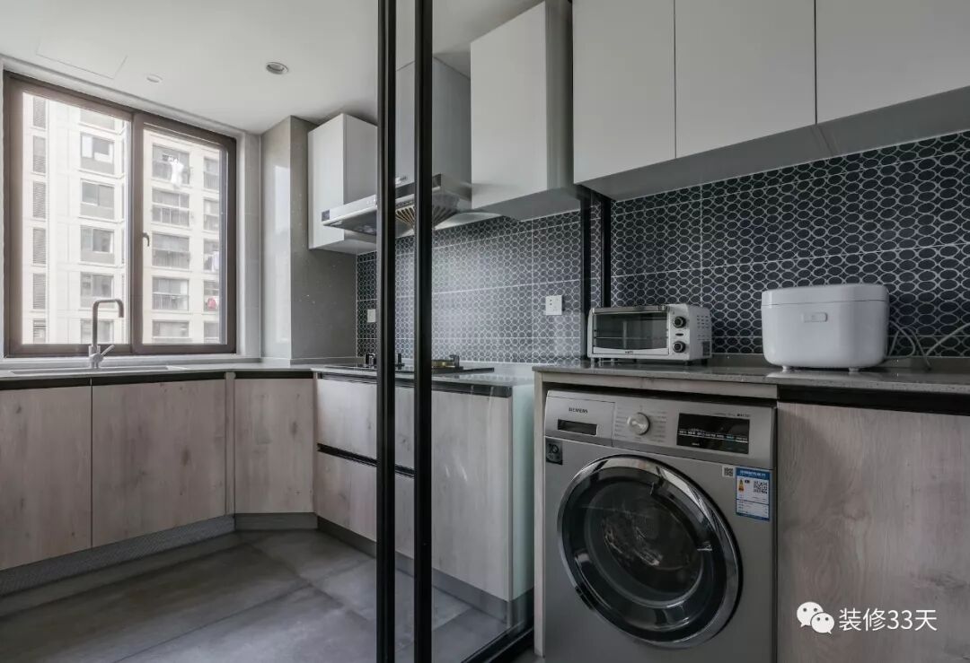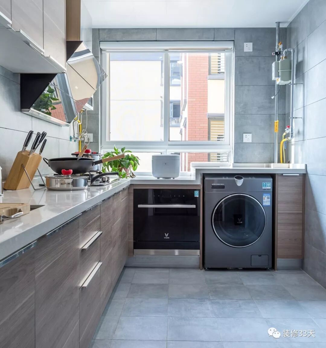 嫌厨房的油烟比较大的话,下面这个案例中正好厨房门外有一块位置,于是把洗衣机安排在了厨房外面的西厨区。