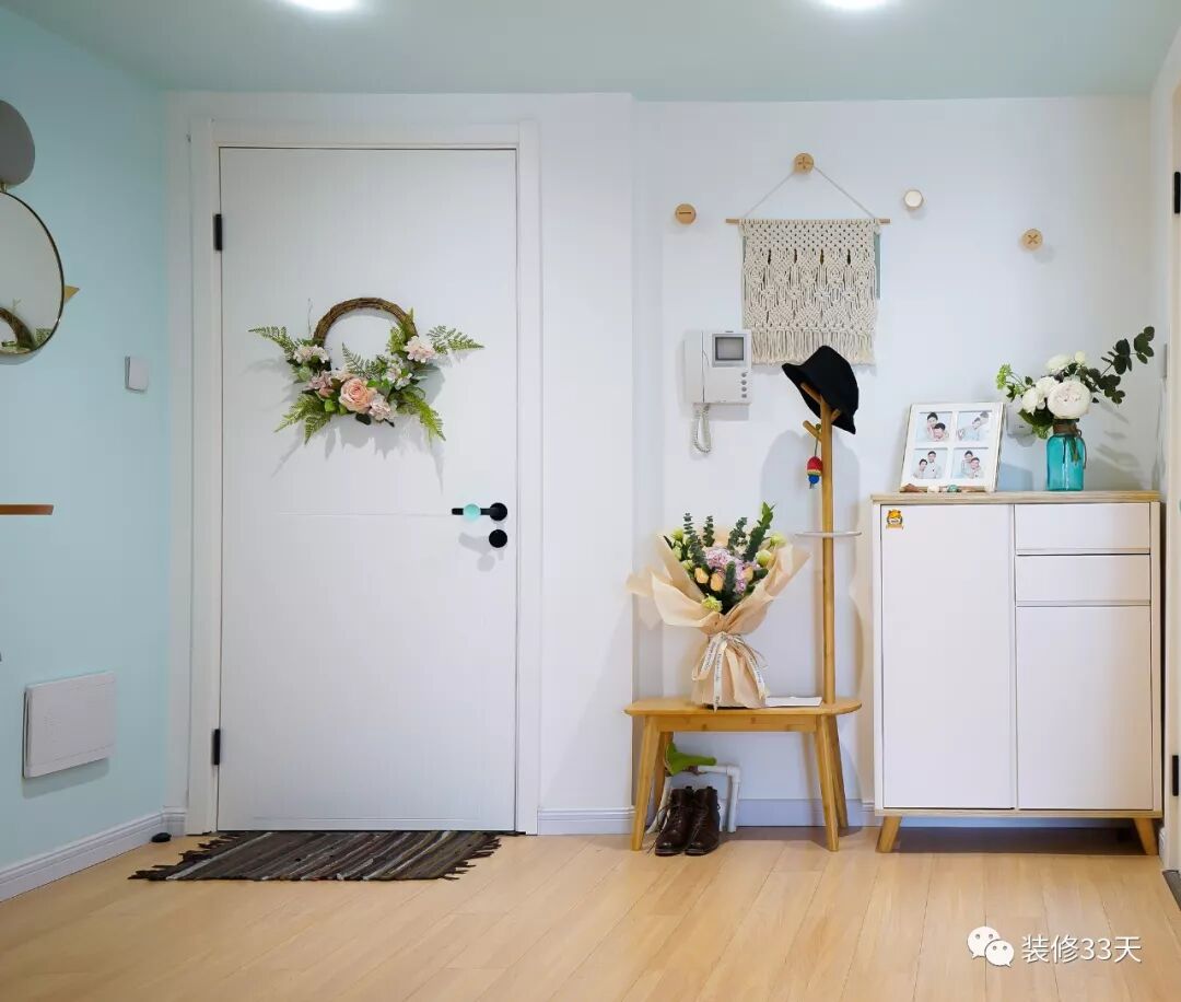▲ 建筑面积90平,造价20万(不含家电),入户左手边就是一个可以挂帽子的小鞋凳,常穿的拖鞋直接塞到鞋凳下面,不常穿的鞋子都塞在鞋柜里,保证干净整齐