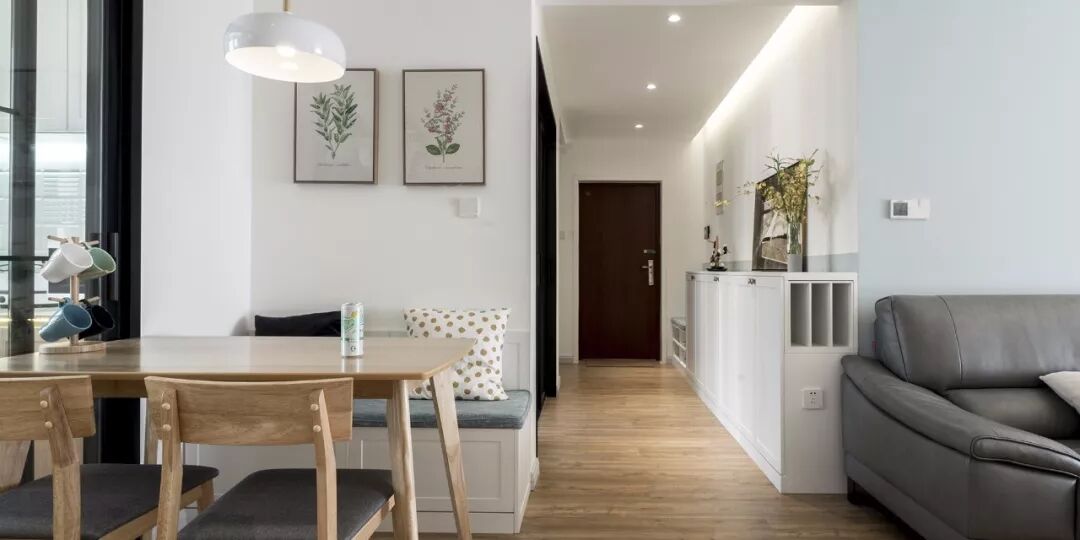 ▲ 采光最好的走廊改造为餐厅,利用内凹的墙体结构设计卡座,在满足多人用餐的同时也不影响过道