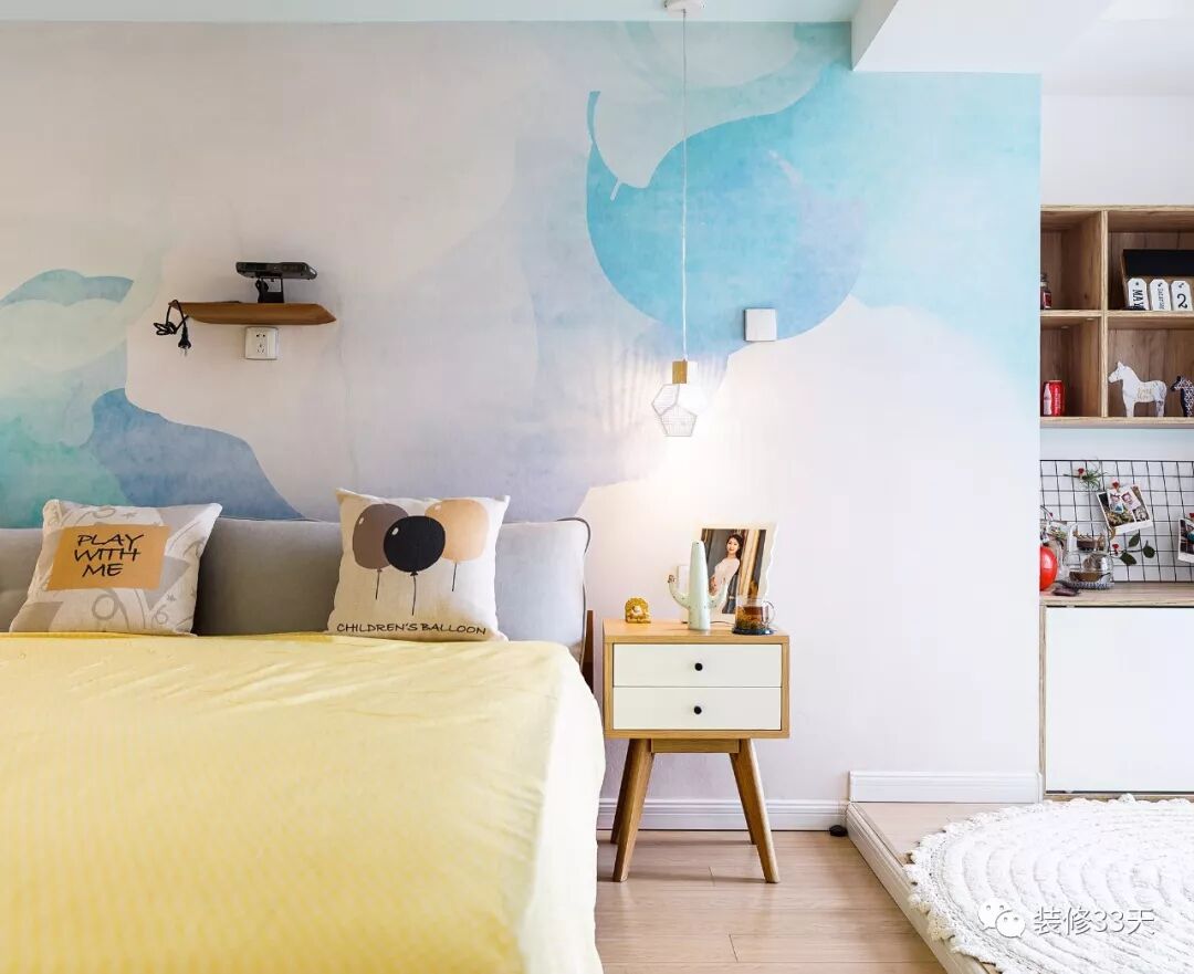 ▲ 床头背景选择了大面积的烟雾图案壁纸,颜色分明具有层次感,但是低饱和的颜色也不会过于抢眼