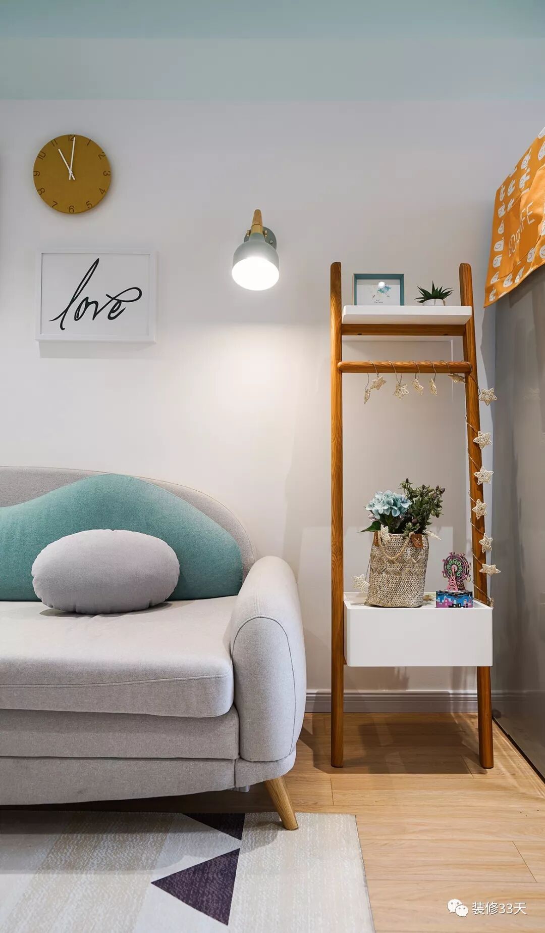 ▲ 沙发旁的云梯角柜,可以减轻厚重冰箱给人带来的压迫感,星星夜灯随意的缠绕其中,开启时星星点点的灯光更是带来浪漫氛围