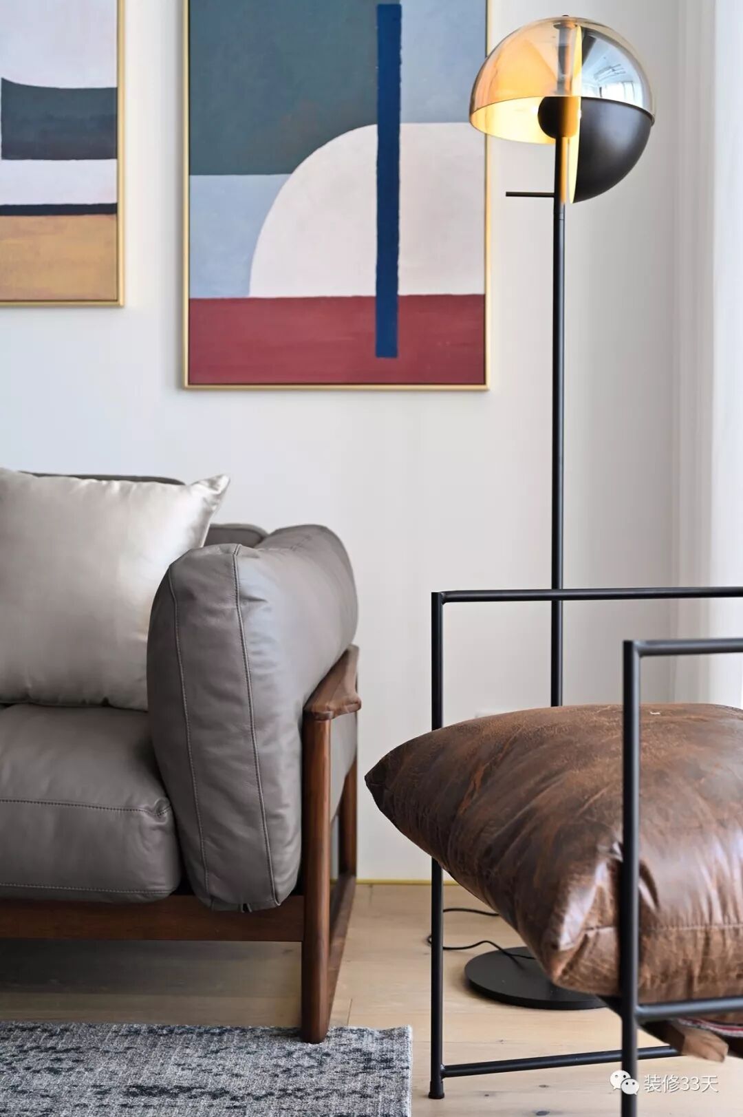 ▲ 家具采用皮质、铁件搭配原木的质感,落地灯的造型与装饰画一样充满艺术感