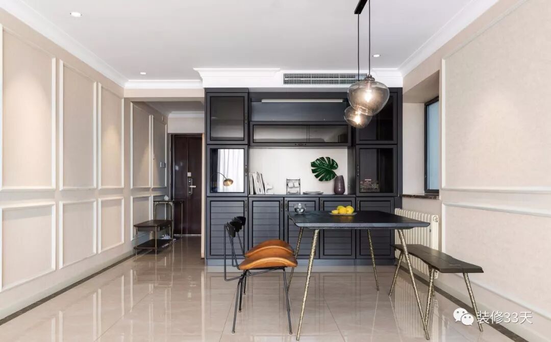 ▲ 餐厅区域追求整体干净的区块和线条,黑色烤漆餐边柜将视觉聚拢,灯具、餐桌椅轻盈而有质感