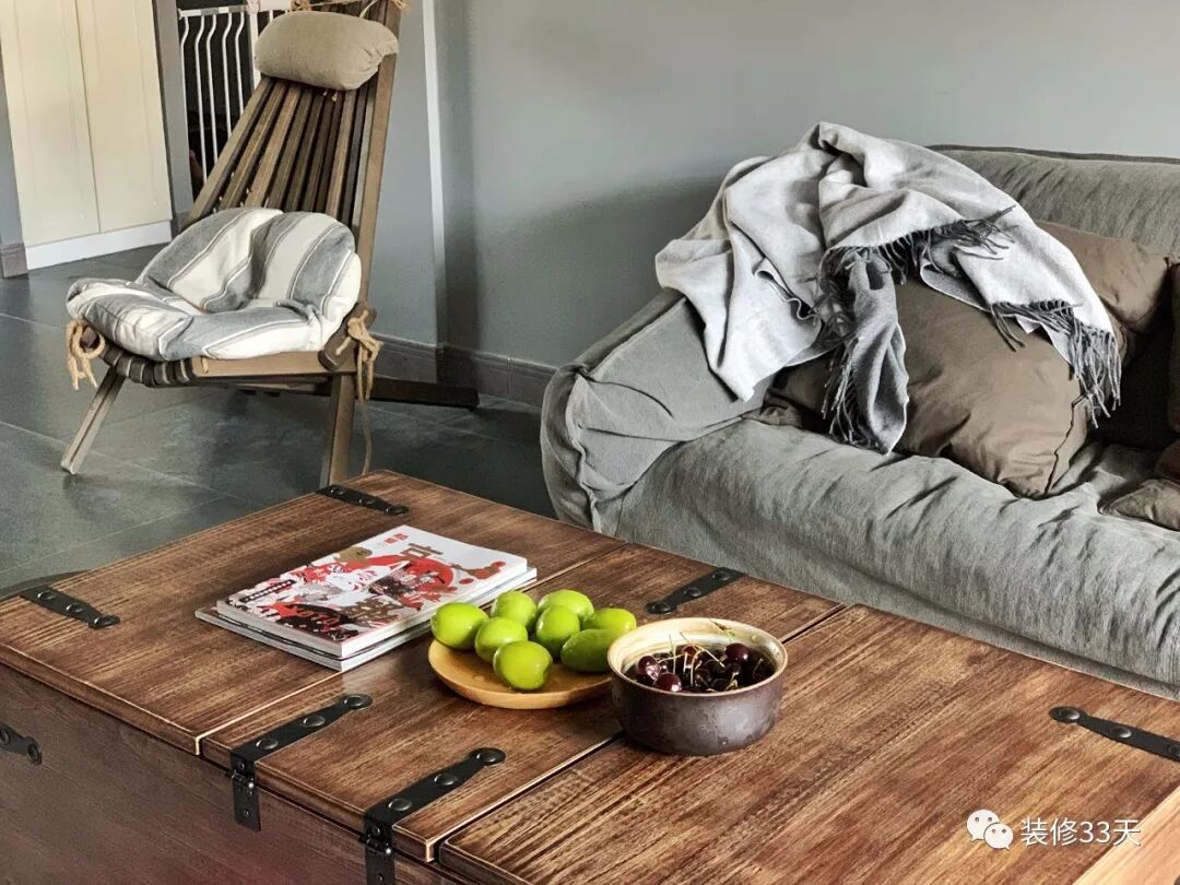▲ 浅灰色布艺沙发和水曲柳实木储物茶几、休闲式单人沙滩椅显得相当和谐,复古新颖又舒适自然,散发出一种强烈且浓郁的文艺气息