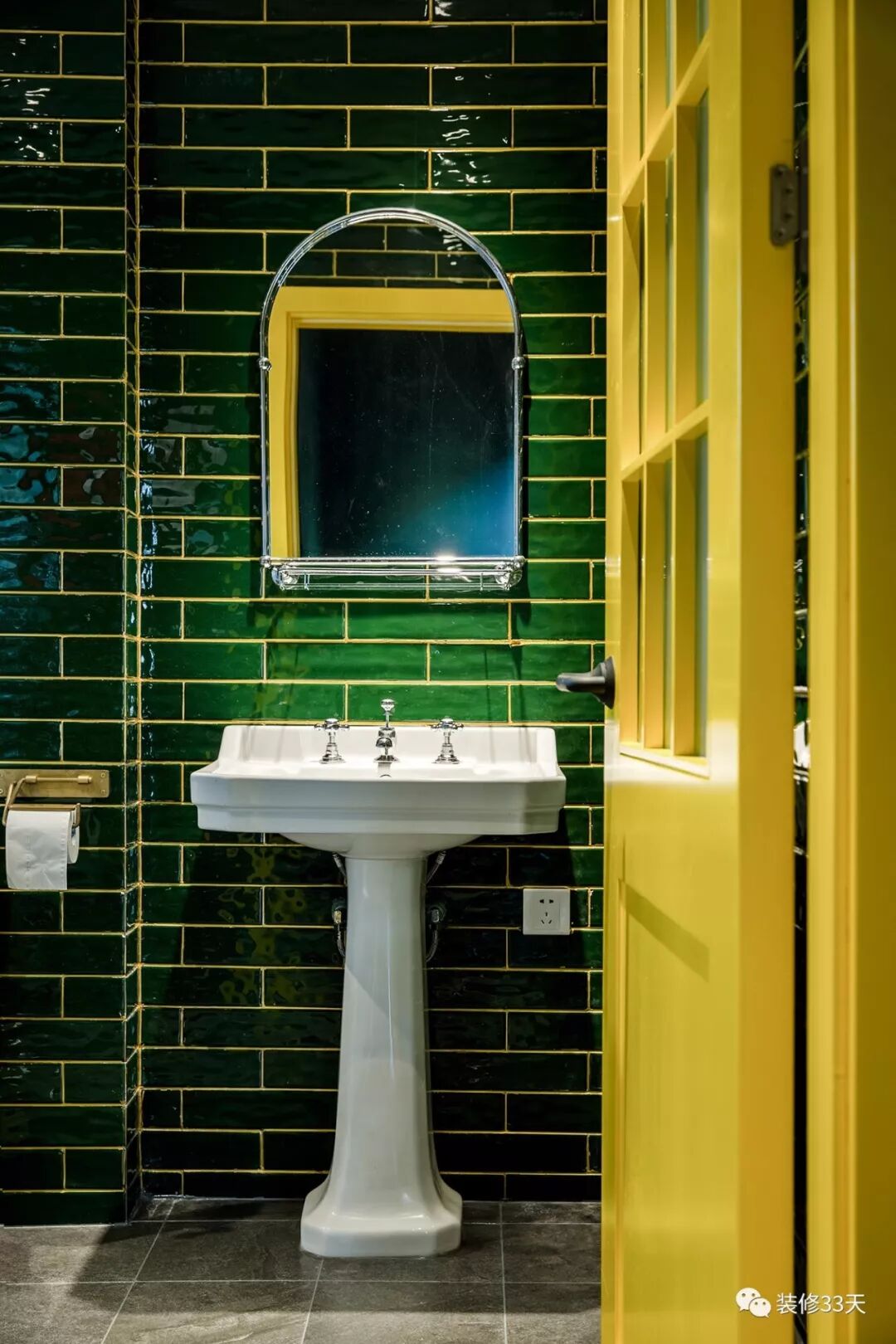 ▲ 卫生间,老式造型台盆与拱型浴室镜,在绿色墙砖+黄色美缝的映衬下,色彩亮丽且大胆,更加凸显出业主的品味和格调,略带文艺清新的网红气息