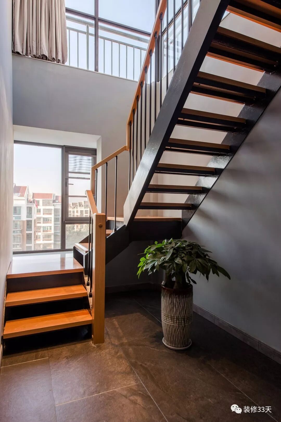 ▲ 旋转式楼梯,紧挨大大的落地窗,不失为一个向远方眺望的最佳角落