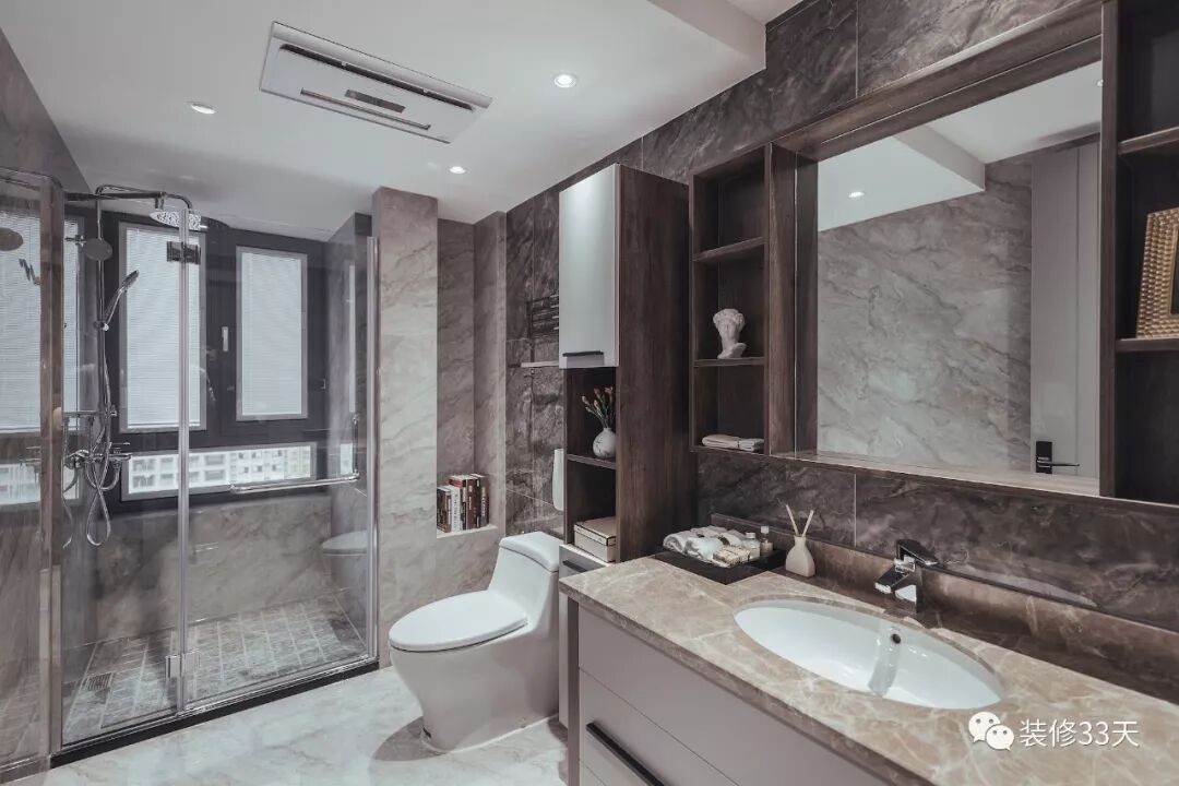镜柜一定要做薄,大概厚度有15-20厘米就够用了,能放下一个牙杯就够了。一方面深度太厚用不到,都是放些瓶瓶罐罐,放一层就够,不然第二层也不好拿;其次,毕竟是吊柜,太厚了还容易撞头。