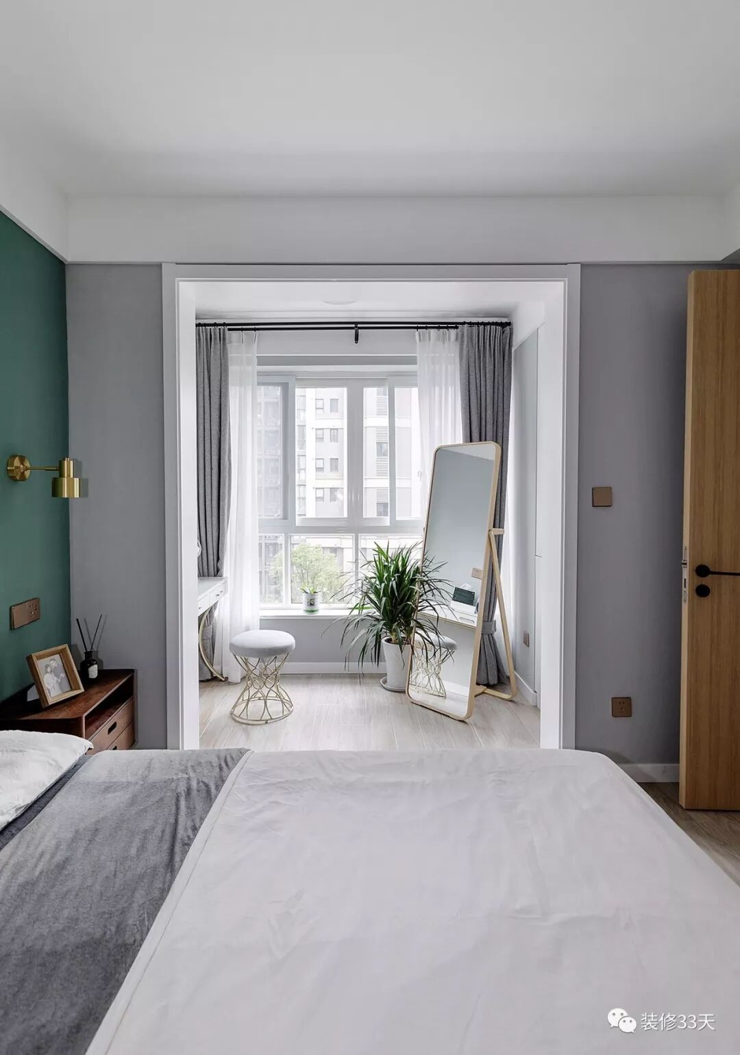 ▲ 次卧灰色的墙面,原木的家具,冷暖对比,床头金色点缀的小吊灯趣味满满