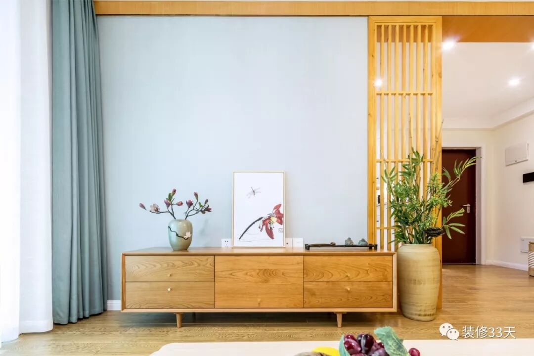 ▲ 木色的家具与淡蓝电视背景墙相呼应,素雅、清新,一点淡淡的禅意