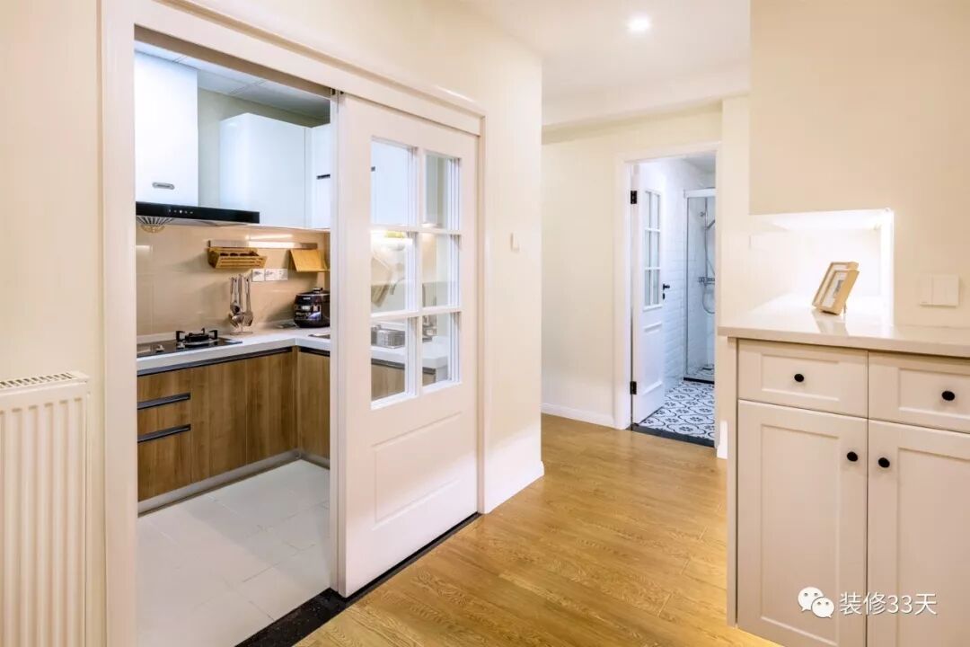 ▲ 厨房的白色推拉门与客厅的木格珊将空间划分明确