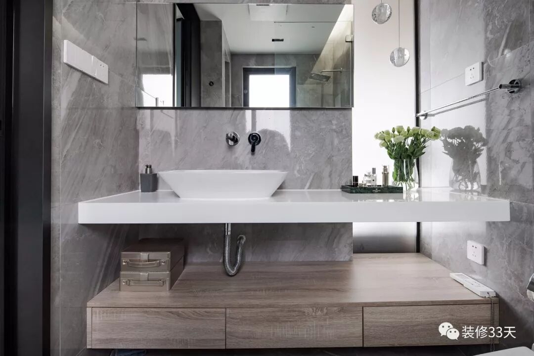 ▲ 主卫整体使用意大利灰的瓷砖墙面,干区 LED 镜下使用入墙式龙头和台上盆,洗手池下方是一排悬空木质抽屉,增加收纳的同时也方便清扫