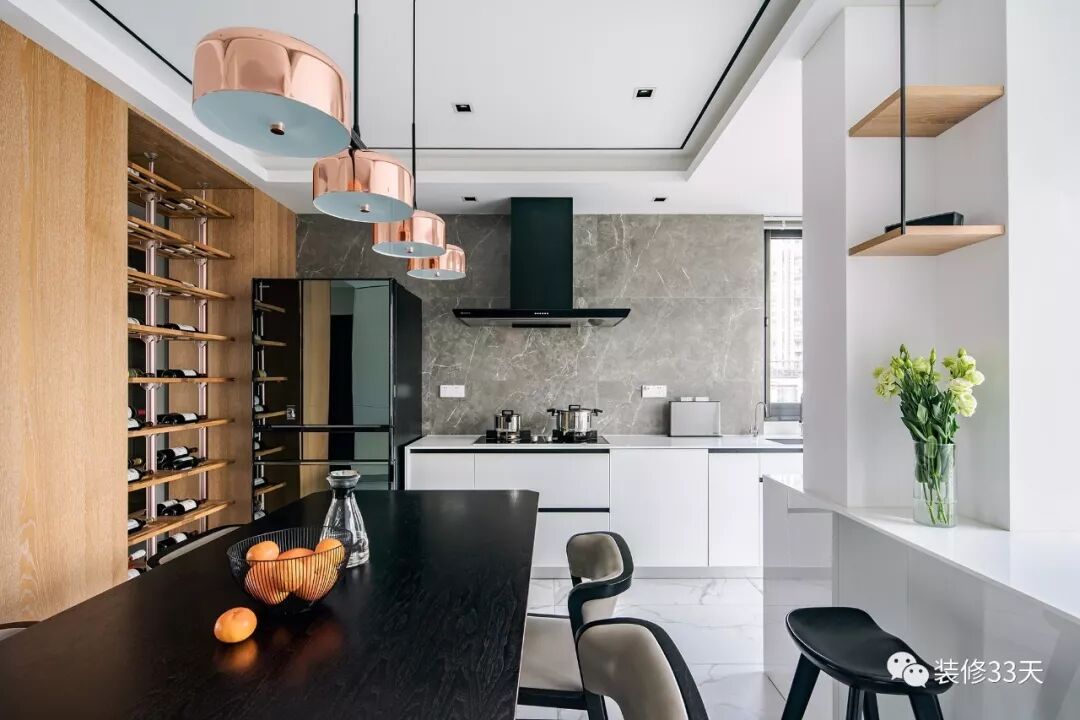 ▲ 餐厅在岛台和走廊之间,玫瑰金北欧金属吊灯下是黑色锐驰餐桌组,质感高级,简约大方,平衡餐厅厨房使用的大量白色,恰当好处地拉低视觉重心