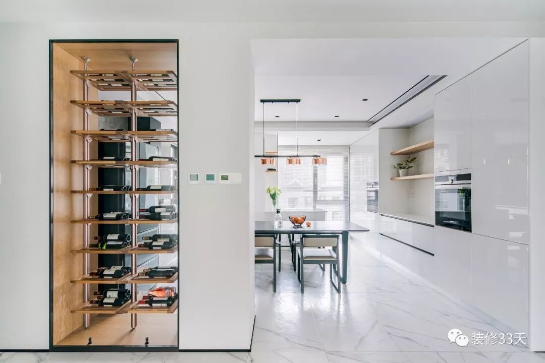 ▲ 木质酒柜作隔断,酒柜从靠走廊一侧做黑钛窄边框,做成镂空,充分保证过道采光,提升空间通透性