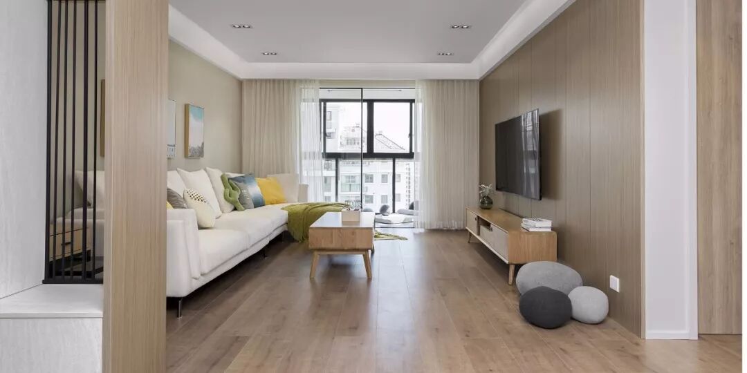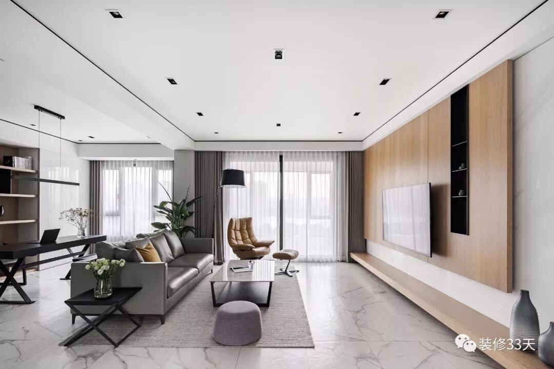 ▲ 白色大理石+木饰面电视墙自然又大气,木饰面做不规则抽缝,采用黑钛做一小片展示柜,通过不同材质的运用来丰富空间层次